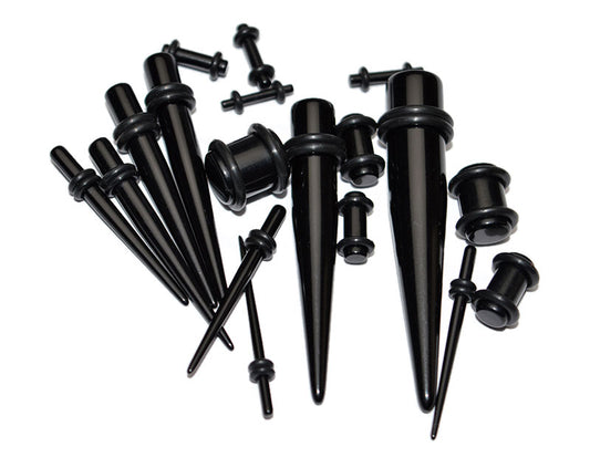 Schwarzes Ohr-Stretching-Set für Anfänger von 14g bis 00g. Ohr-Tapers und Ohr-Plugs. Schwarze Ohr-Stretcher