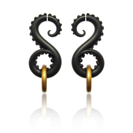 Tentakel-Ohrringe, Oktopus hält Ring, Schwarzgold, Tentakel-Messgeräte, gefälschte Ohrstöpsel