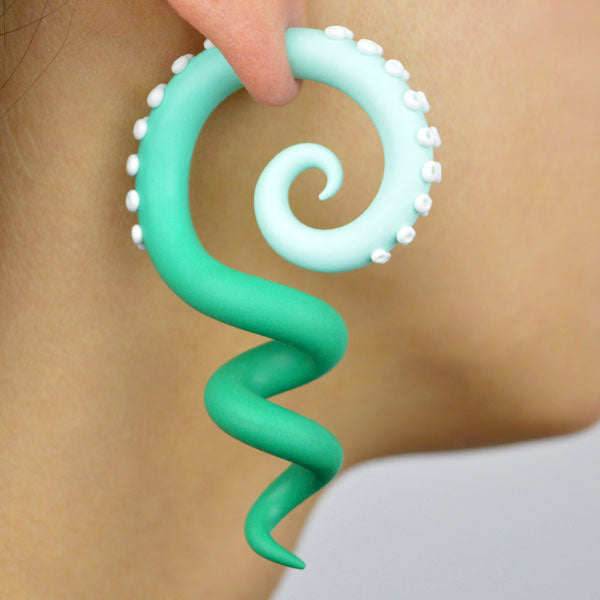 Ich habe diese falschen Tentakelmaße als asymmetrische Creolen oder asymmetrische Spiralohrringe mit mintgrünem Ombre und weißen Punkten hergestellt. Asymmetrische Ohrringe in Form eines Oktopus-Tentakels. Asymmetrische Ohrhänger als Ohrringe, die wie Messgeräte aussehen und als echte Ohrdehner. Asymmetrische Ohrstecker von Tania Chernova.