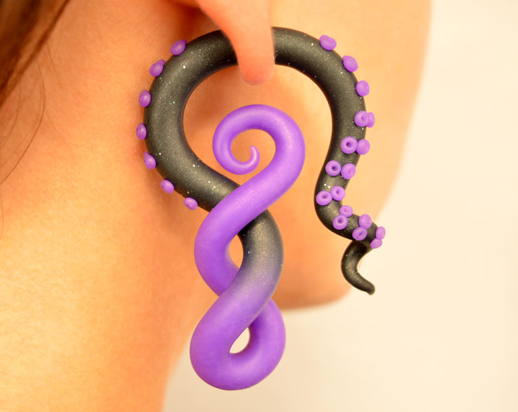 Ursula, die Meerhexe, inspirierte mich zu diesen Tentakel-Ohrringen aus Meerjungfrauen-Oktopus-Ohrringen mit glitzerndem schwarz-lila Farbverlauf. Ursula-Ohrringe von Tania Chernova. Ich fertige sowohl Fake-Ohrringe (Ohrstecker) als auch echte Ohrmessgeräte (für gemessene Ohrläppchen). Ohrringe sehen gut aus mit schwarzem und lila Ombre-Haar, Ursula-Cosplay-Kostüm. Doppelhelix-Ohrringe.