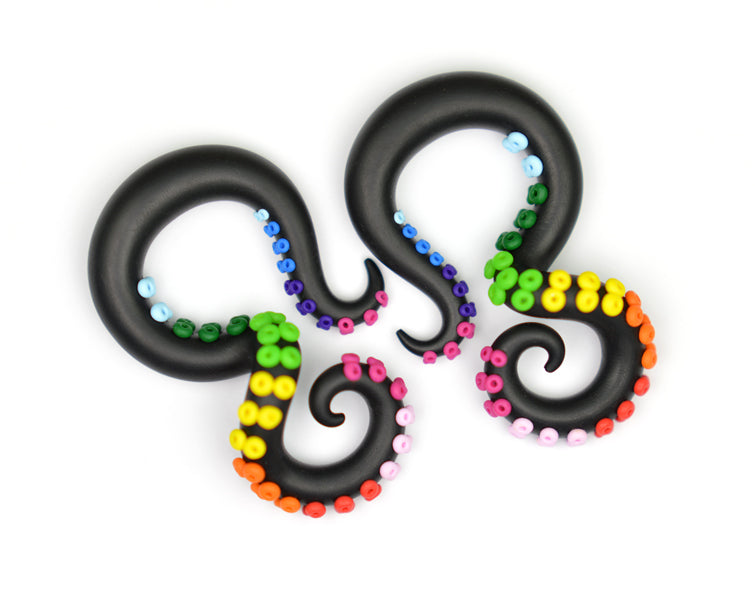 Schwarze Tentakel-Ohrringe mit Regenbogenpunkten, Fake-Gauge-Ohrringe
