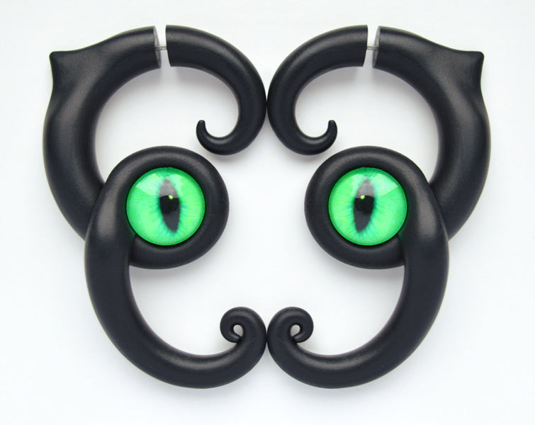 Katzenohrringe, einzigartige schwarze Katzenaugenohrringe von Tania Chernova, Katzenschmuck. Handgefertigte Kätzchenohrringe. Kätzchenohrringe. Einzigartige Catwoman-Cosplay-Ohrringe, schwarze Katzenrassen mit grünen Augen, Catwoman-Ohrringe. Handgefertigte Ohrringe, die wie das Gesicht einer Katze aussehen. Fake-Ohrringe und Ohrmessgeräte für Katzenohren , Katzenohrstöpsel, Katzenohrmessgeräte, Katzenohrstöpsel, Katzenohrmessgeräte.