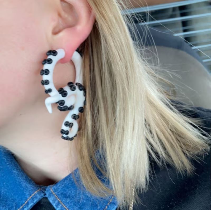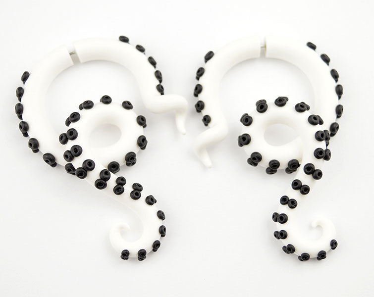 Handgefertigte Fake-Tentakelohrringe für Kopffüßer von Tania Chernova. Cosplay-Oktopus-Messgeräte für gemessene Ohrläppchen und Ohrringe, die wie Messgeräte aussehen. Ich habe diese gefälschten Tentakelmessgeräte in Weiß mit schwarzen Saugnäpfen hergestellt.