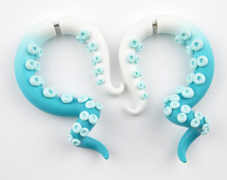 Ich habe diese gefälschten Ohrringe mit weißen und türkisfarbenen Ombre- und Mint-Punkten hergestellt. Für diese Oktopus-Tentakel-Ohrringe fertige ich sowohl Ohrmessgeräte als auch Fake-Plugs an. Hierbei handelt es sich um maßgeschneiderten Schmuck von Tania Chernova, Sie können also beliebige Farben aus der Palette auswählen und ich werde ihn in den von Ihnen gewählten Farben für Sie anfertigen.