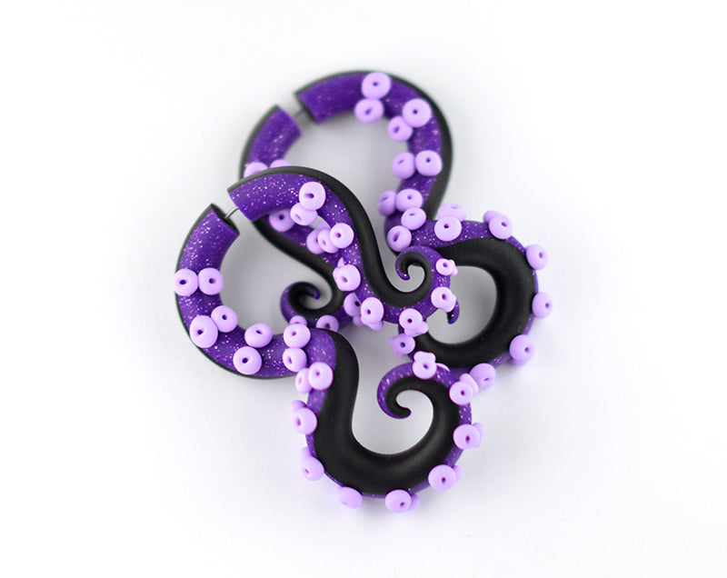Glitzernde lila und schwarze Tentakelohrringe mit hellvioletten Punkten, gefälschte Messgeräte und Ohrstöpsel für gemessene Ohren