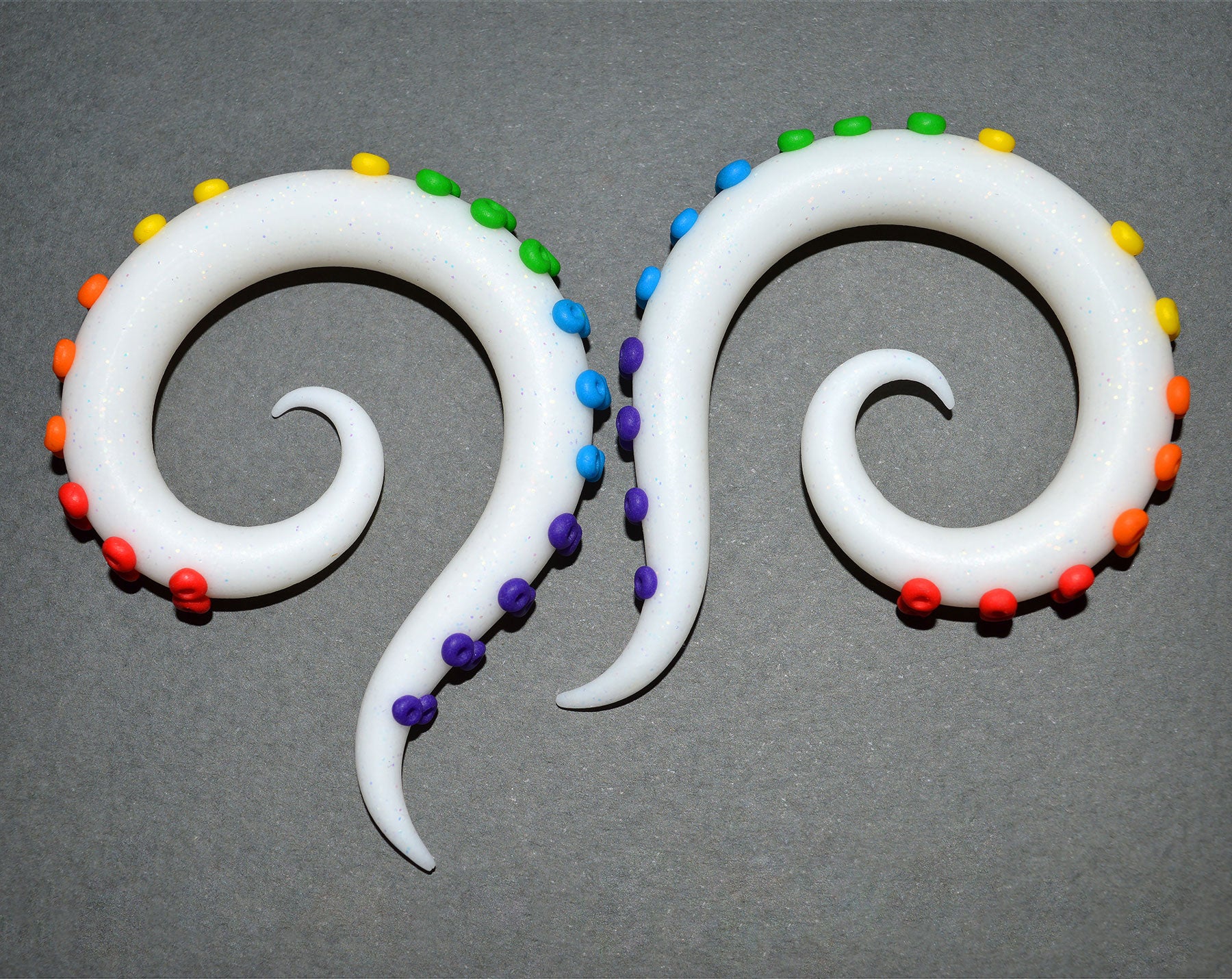Glitzernde weiße Tentakel-Ohrringe mit Regenbogenpunkten. Tentakel-Ohrmessgeräte