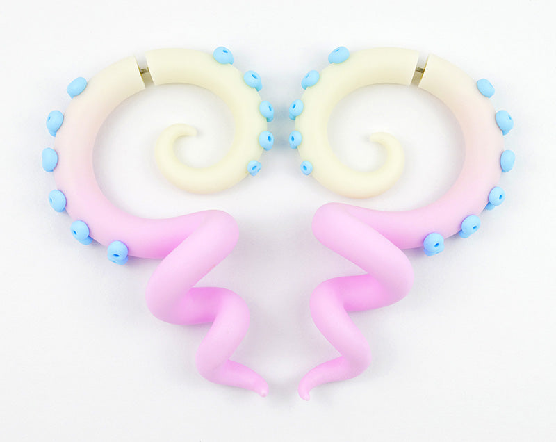 Ich habe diese Tentakel-Ohrringe mit Ombre von leuchtendem Hellgelb bis Hellrosa und mit hellblauen Saugnapfpunkten, Fake-Gauge-Ohrringen / Fake-Gauges und Ohrmessgeräten für gemessene Ohrläppchen angefertigt. Einzigartige handgefertigte Oktopus-Ohrringe von Tania Chernova. Yami kawaii Pastell Goth Ohrringe, kawaii Kunst.