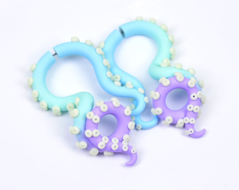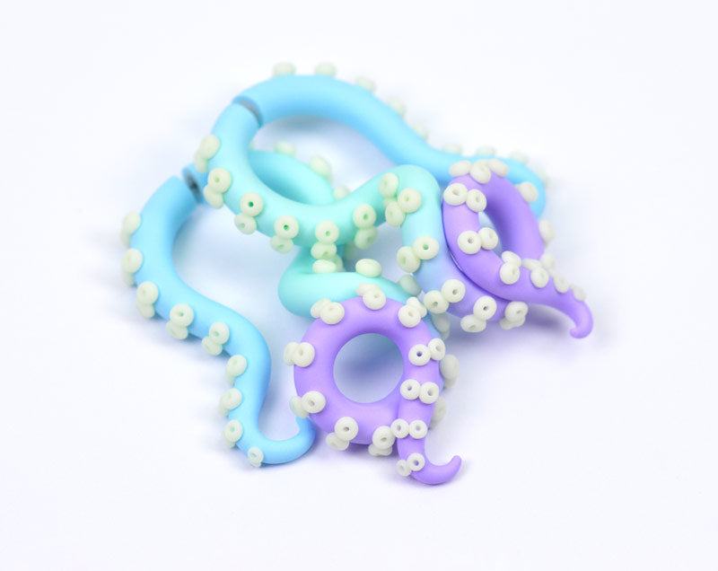 Kawaii Tentakel-Ohrringe mit Ombre-Hellblau-Hellgrün-Helllila und nachtleuchtenden Saugnäpfen