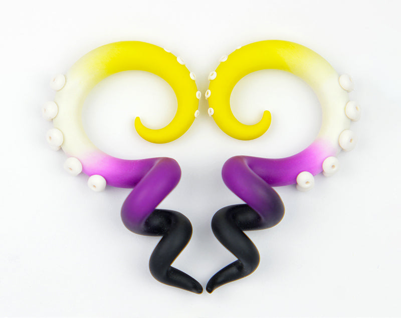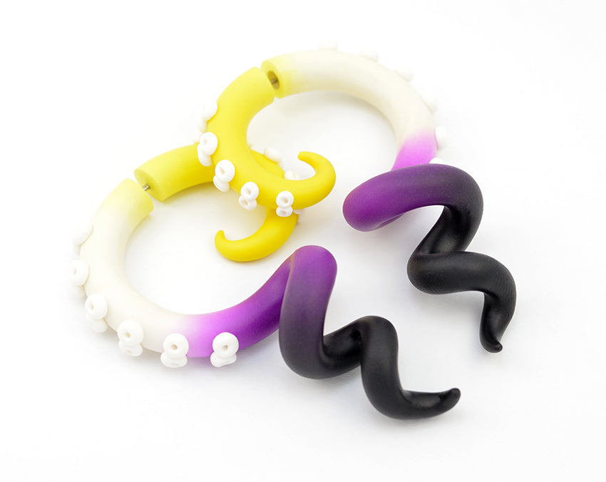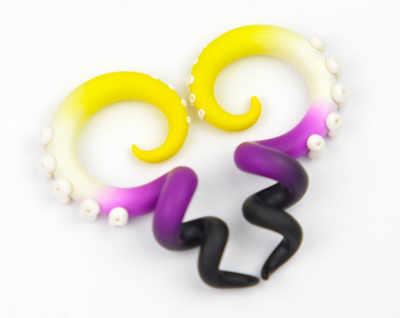 Einzigartige nicht-binäre Ohrringe von Tania Chernova, LGBT-Oktopus-Tentakel-Ohrringe, nicht-binärer Stolz, nicht-binärer Schmuck. Nicht-binäre Ohrringe, genderqueere Ohrringe. Gefälschte Ohrringe und Ohrmessgeräte/Ohrstöpsel für gemessene/gedehnte Ohrläppchen. Nicht-binäre Tagesohrringe in Gelb, Weiß, Lila und Schwarz für nicht-binäre Völker. Nicht-binäre Geschlechtervibes.