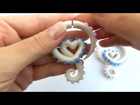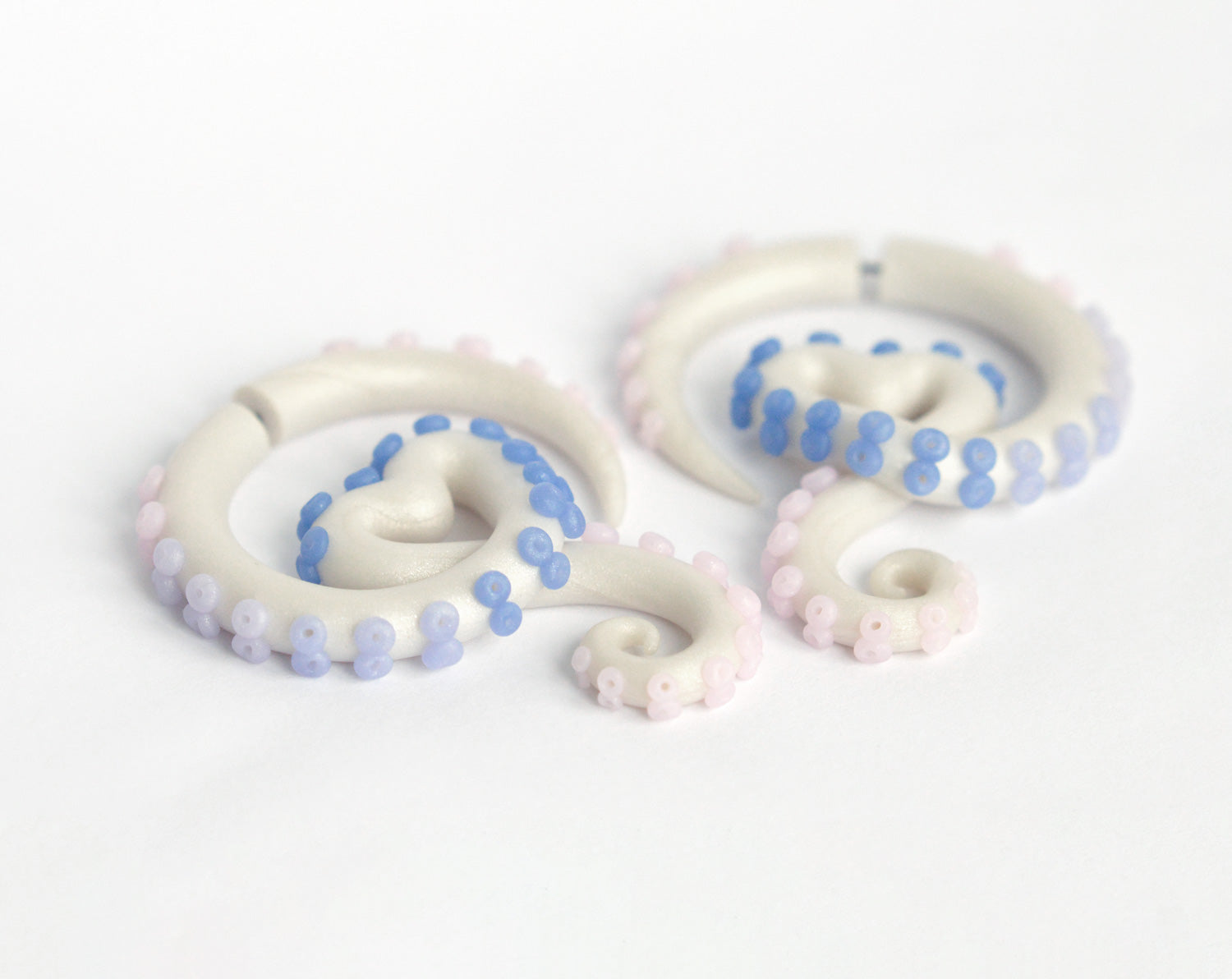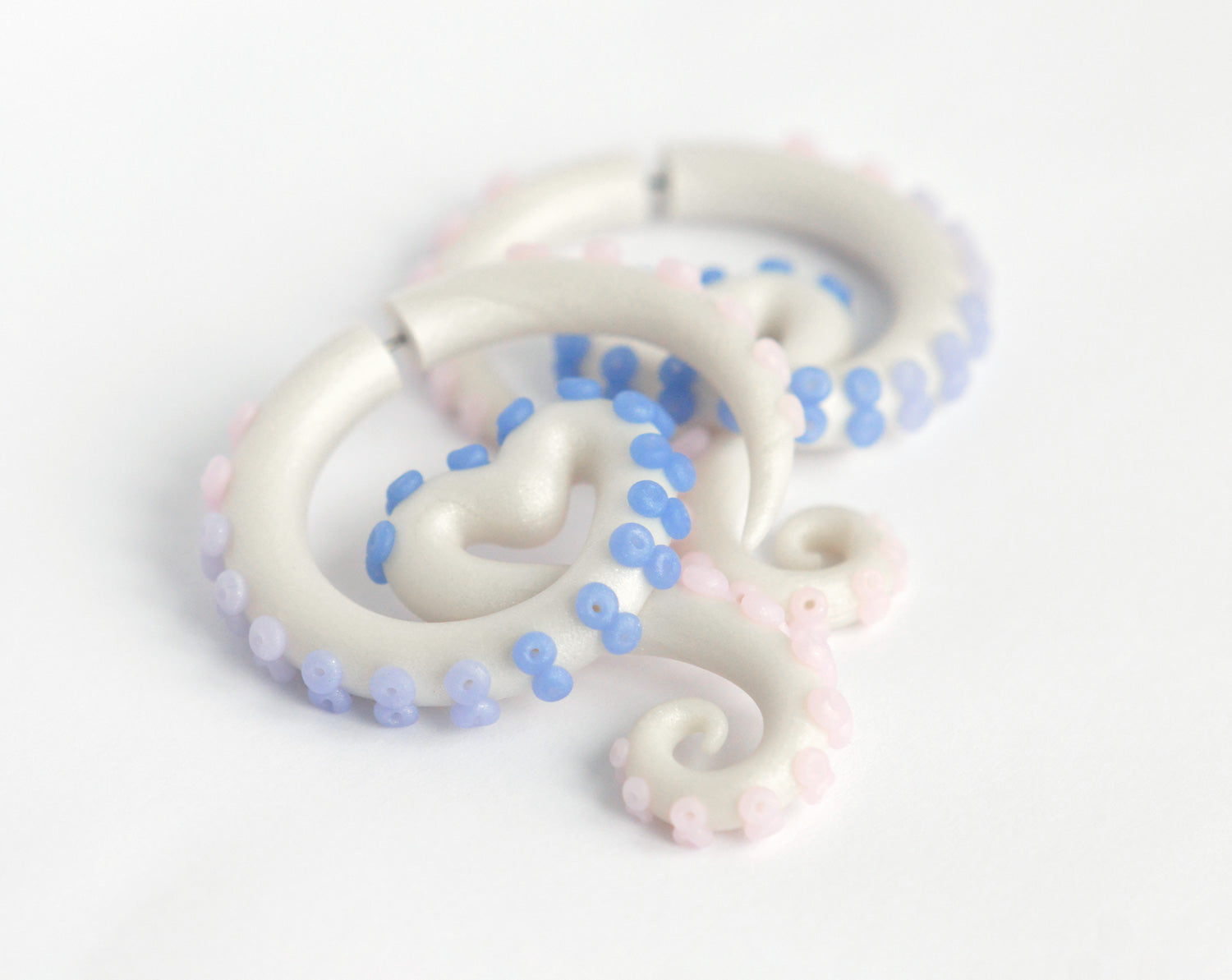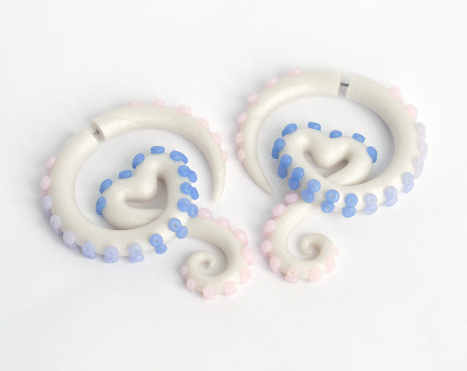 Ich habe diese Oktopus-Tentakel-Ohrringe in Perlweiß mit Saugnäpfen in durchscheinendem Blau mit Glitzerstaub und durchscheinendem Rosa mit Glitzerstaub hergestellt. Diese Farben erinnern mich an einen Sonnenuntergang über dem arktischen Eis. Eine ausgezeichnete Wahl für Winterohrringe zu Weihnachten oder für alle, die einfach kalte Farben lieben. Diese Ohrringe könnten Sie interessieren, wenn Sie auf der Suche nach Schneeflockenohrringen, weißen Ohrringen oder Weihnachtsohrringen sind oder wenn Sie ein Fan des nautischen Ozeanthemas sind und Dinge lieben, die mit dem Meer zu tun haben. Diese perlweißen Ohrringe sind sowohl als Fake-Ohrstecker als auch als echte Ohrstecker für gedehnte Ohrläppchen erhältlich. Diese Ohrringe können auch zu pastellfarbenen Gothic- und Yami-Kawaii-Outfits nützlich sein. Zu einer Herzform gedrehte Tentakelohrringe. Maßgefertigte Ohrringe von Tania Chernova.