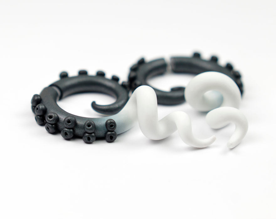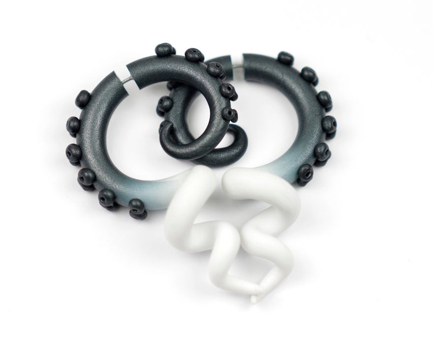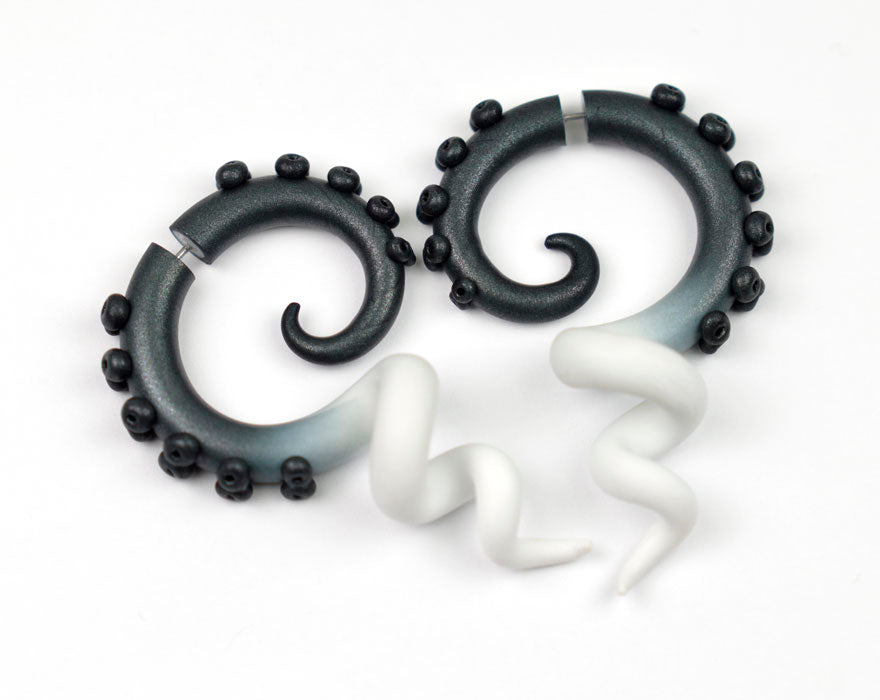 Schimmernde schwarze Tentakel-Ohrringe in Pastell-Gothic-Optik. Fake-Gauge-Ohrringe und echte Tentakel-Messgeräte