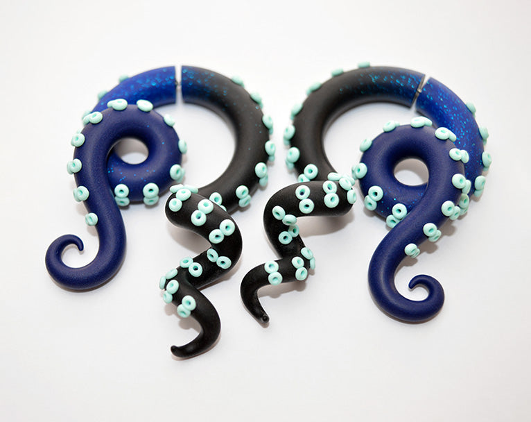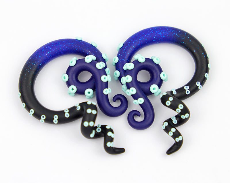Vom Weltraum inspirierte Oktopus-Tentakel-Ohrringe, einzigartige Ohrmessgeräte von Tania Chernova. Handgefertigte Galaxie-Ohrringe, gefälschte Fake-Stecker und echte Ohrdehner in 1 g, 0 g, 00 g, 000 g. Marineblaue, glitzernde, blau-schwarze Ohrringe mit Ombre-Effekt und mintfarbenen Saugnäpfen. Oktopus-Spiralohrringe, Fake-Ohrringe und echte Ohrhänger.