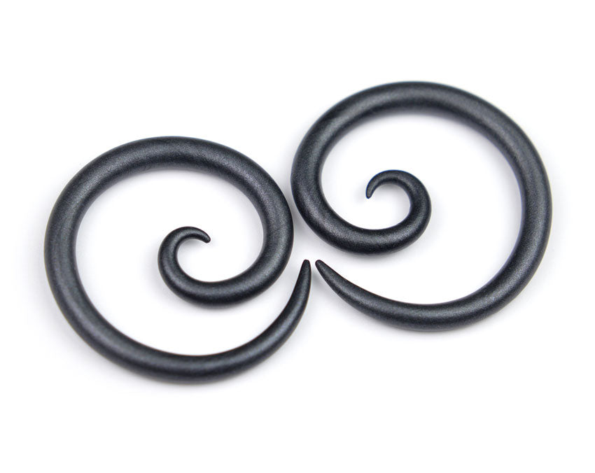 Ich habe diese Spiralmessgeräte in schimmerndem Schwarz hergestellt. Spiralohrringe sind als echte/echte Ohrmaße und als Fake-Ohrringe erhältlich. Handgefertigte Spiralplugs von Tania Chernova.