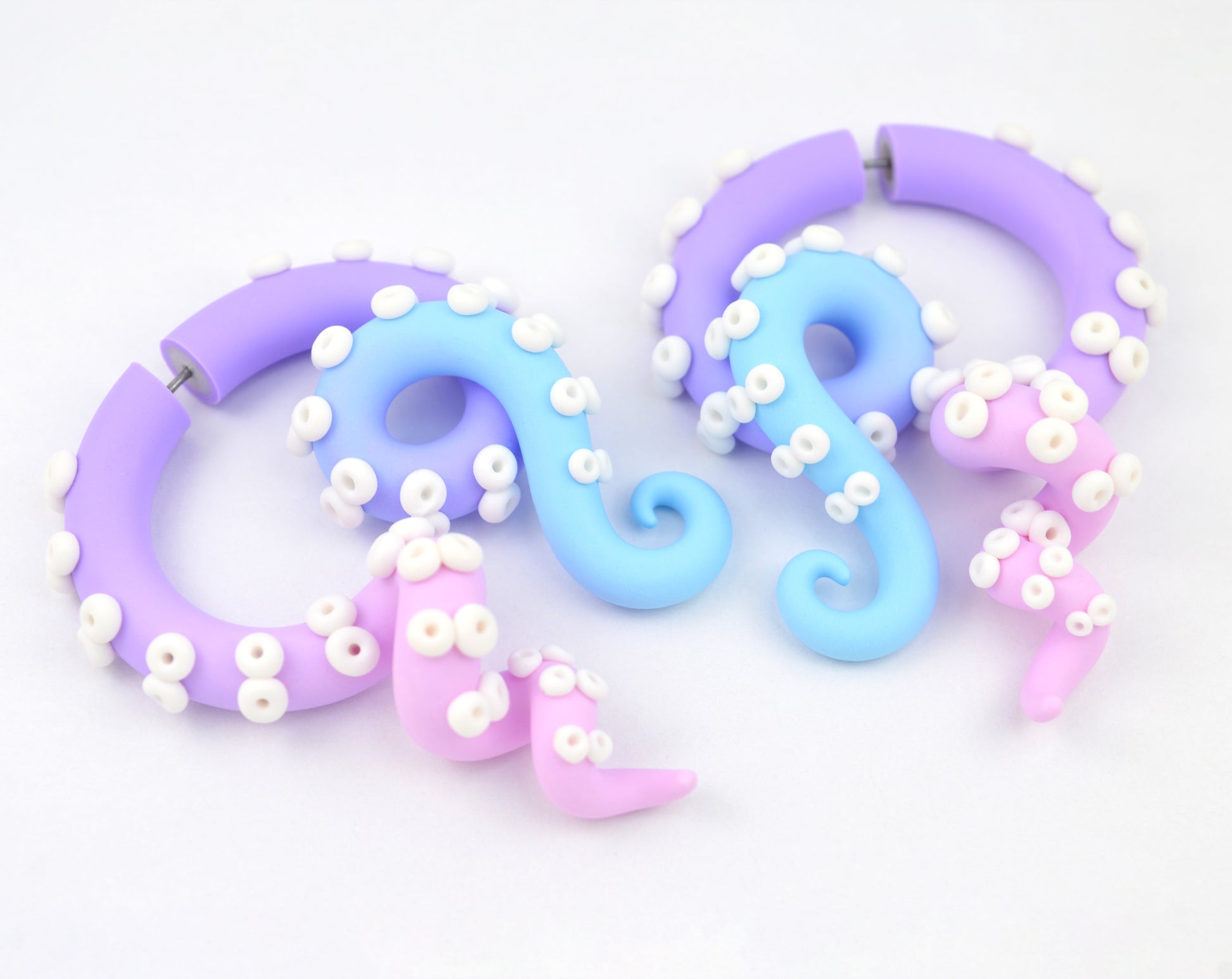 Einzigartige handgefertigte Tentakelohrringe von Tania Chernova. Pastell-Gothic-Outfits, hellblau, hellviolett, hellrosa Oktopus -Tentakel-Ohrringe mit weißen Saugnäpfen, Yami-Kawaii-Fake-Ohrmessgeräte und echte Ohrmessgeräte in 1 g, 0 g, 00 g, 000 g. Fairy-Kei-Outfit-Ideen, Pastell-Ohrringe in niedlichen Farben, Pastell-Outfit. Kpop Sweet Lolita modische ästhetische Oktopus-Ohrringe. Gefälschter Körperschmuck von Tania Chernova.