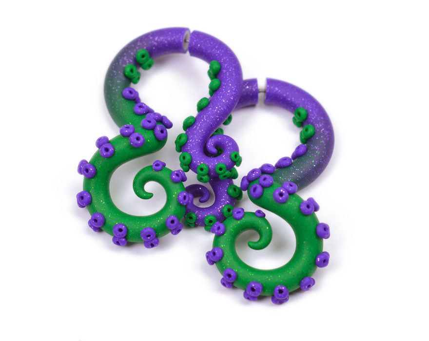 Tentakel Messgeräte Glitzer Lila und Glitzer Grün Ombre Fake Gauge Ohrringe
