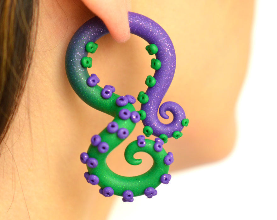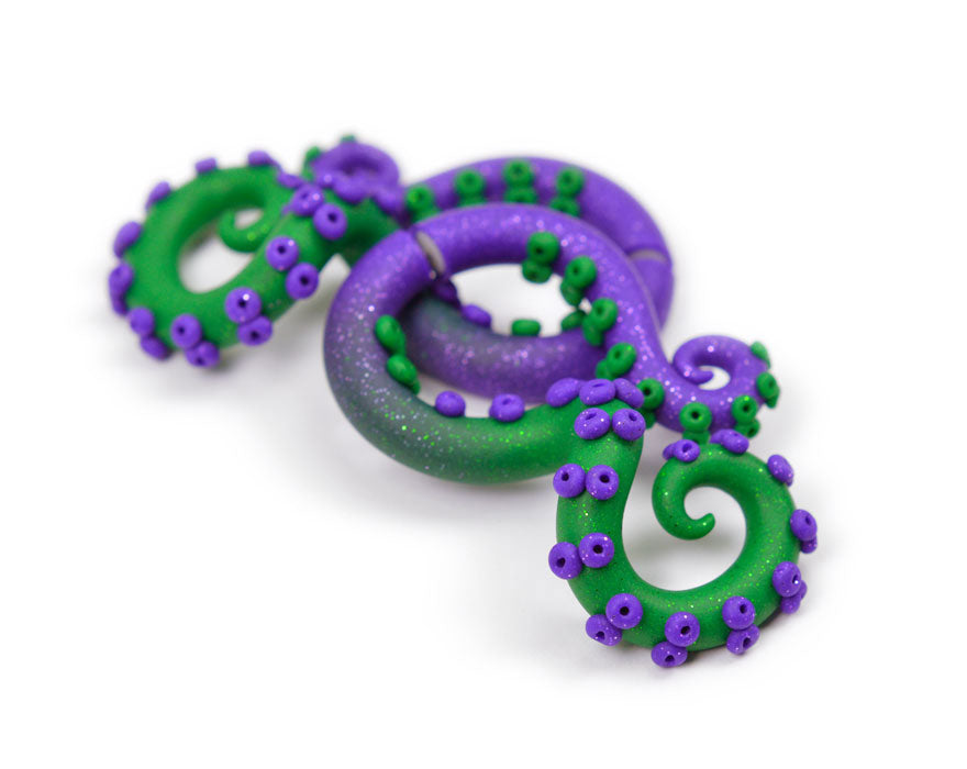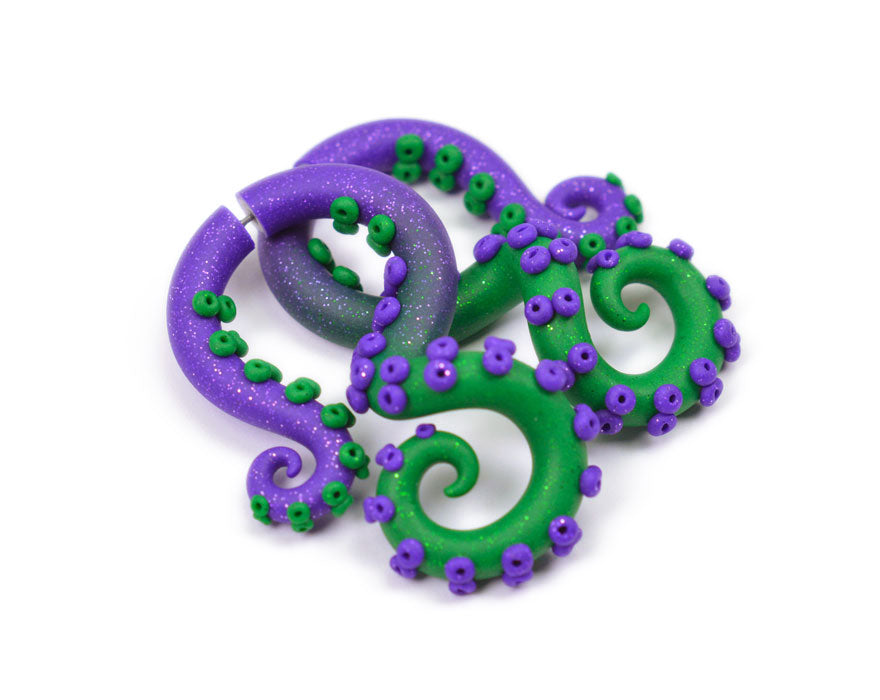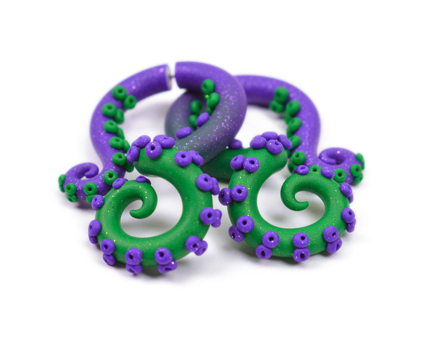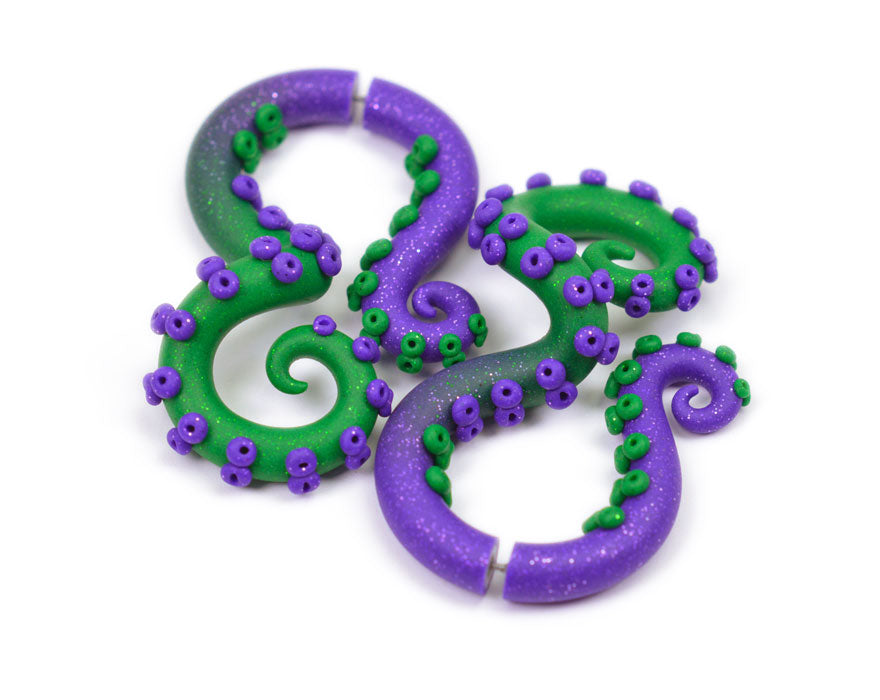 Ich habe diese Tentakel-Messgeräte mit glitzerndem Lila und Glitzer-Grün-Ombre, lila-grünen Fake-Messgeräten und echten Ohrmessgeräten hergestellt. Echte Oktopus-Messgeräte und Ohrringe, die wie Messgeräte aussehen.