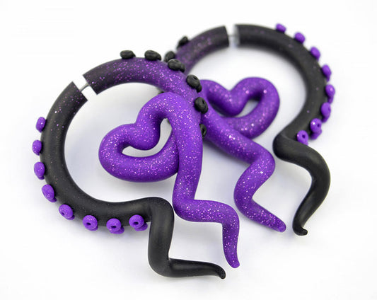 Boucles d'oreilles tentacule violet et noir pailleté avec des points violet clair, fausses jauges et bouchons d'oreille pour oreilles calibrées