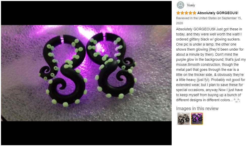 TO INCREASE THE LIFE OF YOUR TENTACLE EARRINGS, DO NOT WEAR THEM DURING SLEEP OR SHOWERS/BATHING. THEY ARE ALSO NOT MEANT TO BE USED TO STRETCH YOUR LOBES! POLYMER CLAY IS VERY SIMILAR TO OTHER ORGANIC POROUS MATERIALS AND SHOULD ONLY BE WORN IN HEALED EARS!